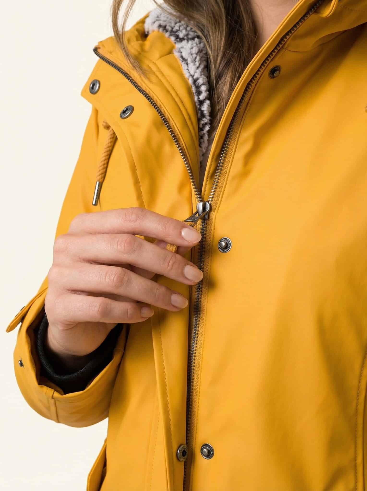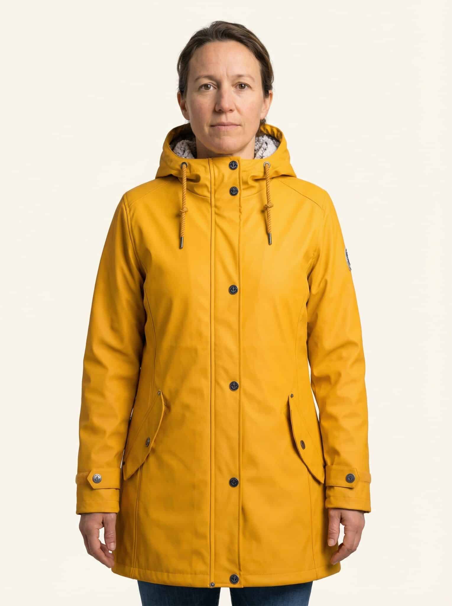 Das Außenmaterial aus 100 % Polyurethan ist wasserdicht mit einer Wassersäule von 10.000 mm und winddicht, sodass Sie auch bei starkem Regen geschützt bleiben. Die verschweißten Nähte verhindern das Eindringen von Feuchtigkeit. Die verstellbare Kapuze und maritime Accessoires verleihen “Jasmina” einen sportlich-funktionalen Look, der an die norddeutsche Küste erinnert, aber ebenso gut in der Stadt oder auf Wanderungen getragen werden kann.